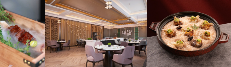 海口威斯汀酒店中国元素中餐厅的儋州沙虫生蚝汤、中国元素中餐厅、西安浐灞艾美酒店乐美中餐厅的云南炊锅糊辣黑山羊